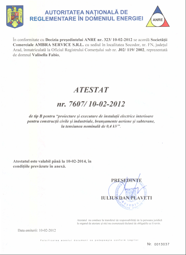 - Atestat de tip B pentru proiectare si instalare de instalatii electrice interioare pentru constructii civile si industriale, bransamente aeriene si subterane la tensiunea nominala de 0,4kV, eliberat de Agentia Nationala pentru Reglementare in domeniul Energiei;